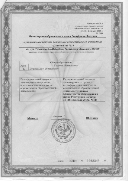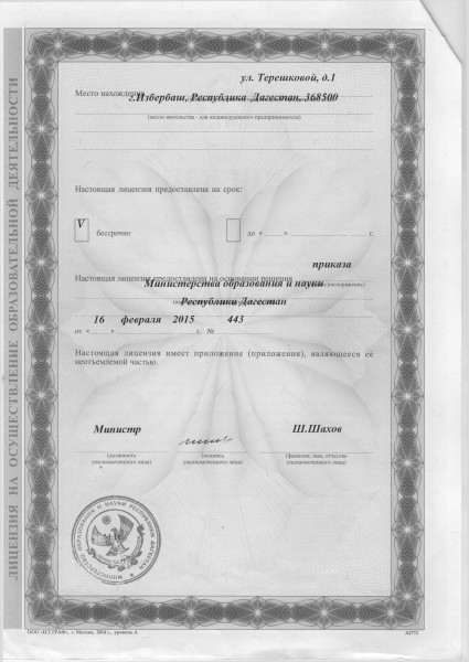 Образовательная деятельность осуществляется по адресу: 368502, РД, г. Избербаш, ул. Терешковой,1
